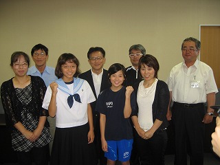今日は、代表して、生徒会長の廣前奈美さん、家庭クラブ会長の上田安友未さんが来庁されました。