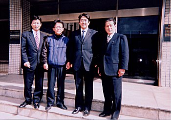 写真左から 西村康稔衆議院議員、かど康彦、安倍晋三 自由民主党幹事長代理、北浦義久 兵庫県議会議員